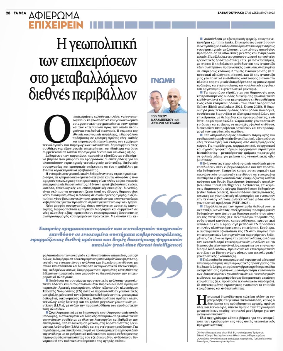 Άρθρο του Επίκουρου Καθηγητή στο Τμήμα Πολιτικής Επιστήμης του Πανεπιστημίου Κρήτης, κ. Αντώνη Αγγελάκη από κοινού με τον Δρ. Νίκο Καραμπέκιο (ΕΛΕ Β’, Προϊστάμενος Τμήματος, Εθνικού Κέντρου Τεκμηρίωσης και Ηλεκτρονικού Περιεχομένου) στην εφημερίδα “ΤΑ ΝΕΑ Σαββατοκύριακο” (Αφιέρωμα Επιχειρείν, 27-28/12/2025), με τίτλο: “Η γεωπολιτική των επιχειρήσεων στο μεταβαλλόμενο διεθνές περιβάλλον”.